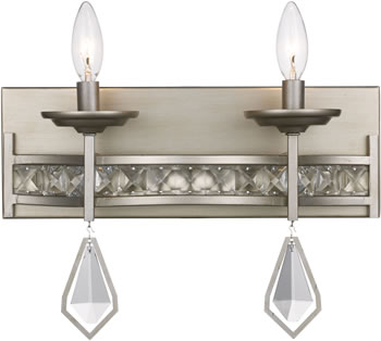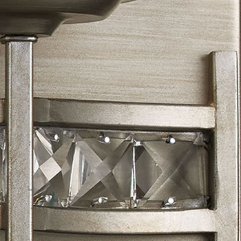 The opulent Eli Vanity Bars feature framed crystal prisms suspended from the Antique Silver Leaf finished frame. A band of square cut crystals are set to replicate the look of vintage jewerly.