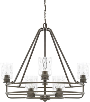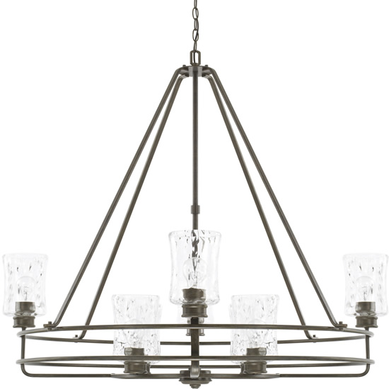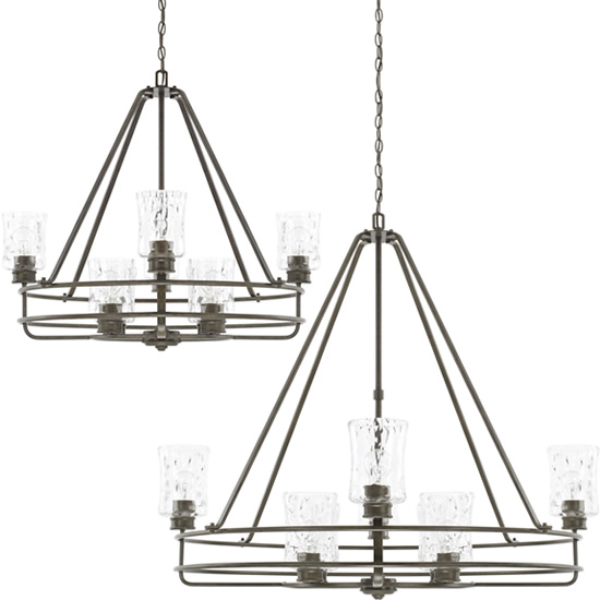 Bristol chandeliers channel modern farmhouse style with a gridded frame fashioned after a rustic basket. Clear Water glass shades soften the lines, lending visual and textural contrast.