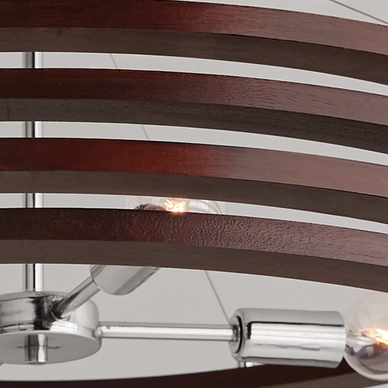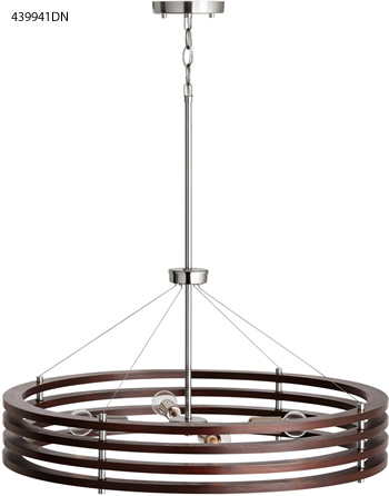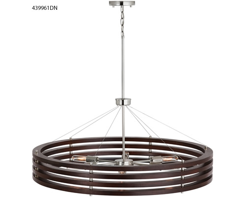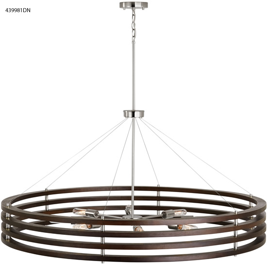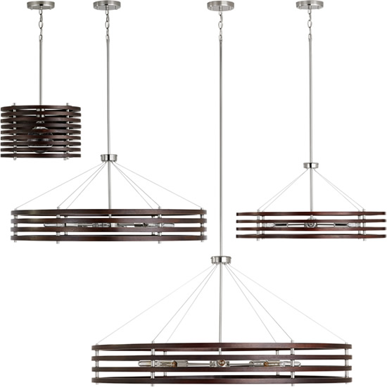 The combination of dark wood geometric rings and polished nickel rod details of the Dalton Collection create contrast and make a striking statement. The character of the mini pendant and 4-Light, 6-Light and 8-Light Chandeliers appeal to modern, contemporary and transitional styles. The modified sphere brings a more eclectic feel to a contemporary natural design.