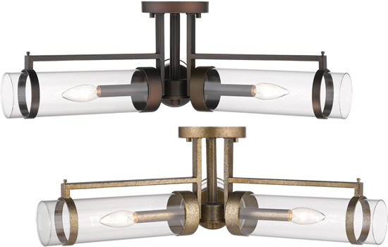 The Millennium Milan Collection has clear glass cylinder shades on a metal frame finished in Rubbed Bronze or Vintage Gold.