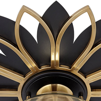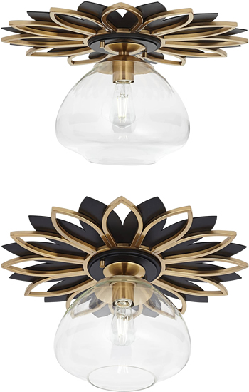 Bring the garden into your decor with a glamorous twist. This modern semi-flushmount ceiling light is a compelling addition boasting a canopy that layers warm brass finish open petals over black finish solid petals, creating bold contrast. From Possini Euro Design, the lamp is complete with a curvy, clear glass shade that adds protection for the bulb (not included) within.