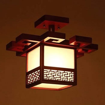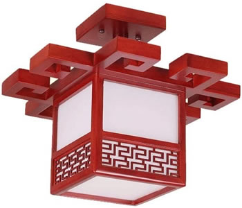 Ornamentally carved wood ceiling light from China with classical design elements.