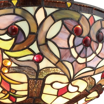 The Carroll Collection features an arrangement of art glass that evokes a heart pattern accented with jewels in red and amber. The Vintage Bronze finish completes the look. Glass color in Tiffany lighting products vary in color. No two pieces are identical.