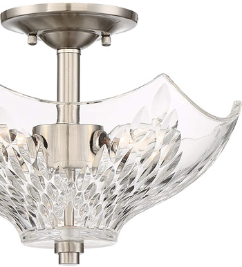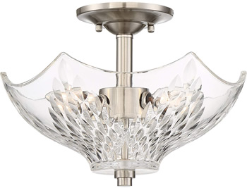 With a simple base and uniquely shaped shade, the Westchester semi-flush is understated elegance. The intricate cuts on the clear glass add a little sparkle and the scalloped edge of the shade further enhances the design. It is finished in a lustrous Brushed Nickel.