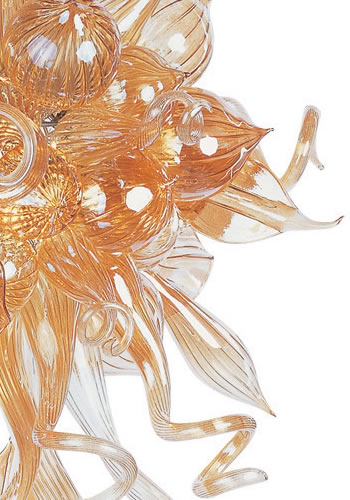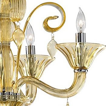Ebullient curves of glass reach to the sky, brilliant drops hang from its arms, and a warm amber light shines from this Murano style chandelier. A golden celebration of craftsmanship and tradition.