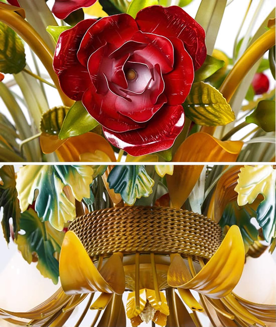Cut metal roses are hand-shaped and hand-painted.