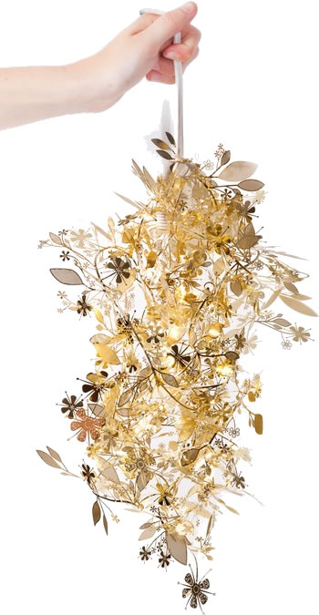 A delicate metal strand of flowers is wrapped around a light bulb to create an organic shade.