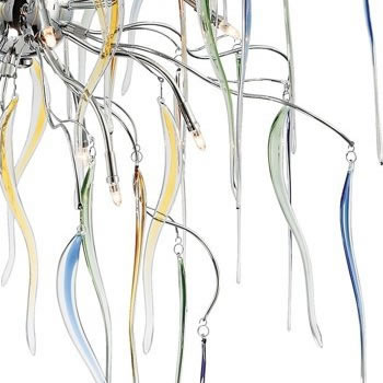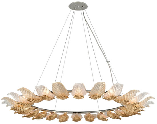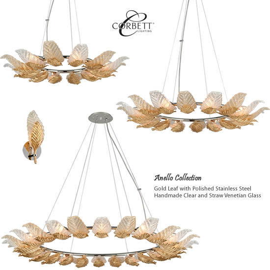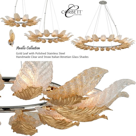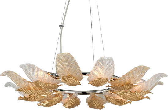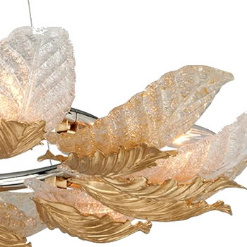 Anello recreates the traditional style Venetian chandelier by taking handcrafted, Venetian glass, worked in detail by Italian artisans, and spotlighting it with a light framework. The result is a ring of leaves that seem to float in the air, finished in straw and clear glass to allow the light to filter through.