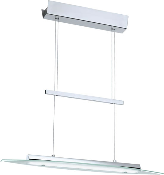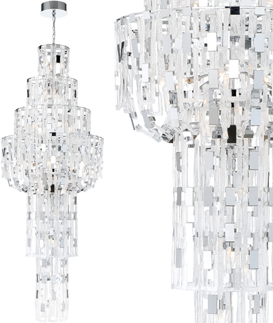 Links of patterned pressed glass cupped by polished chrome clips create a magnificent chain. The textured curtain drapes around the light to capture an opulent glow.