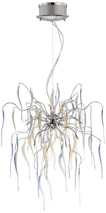 Designer chandelier from Possini Euro Design. Halogen light bounces off the glass pieces and dances with color and brilliance. This modern adaptation of the classic chandelier is stunning with a luminous chrome finish base and details. Each halogen bulb is small in size and designed to be hidden among the sculpted glass. The overall look has a graceful and beautiful quality.