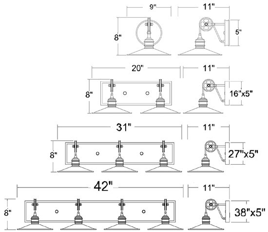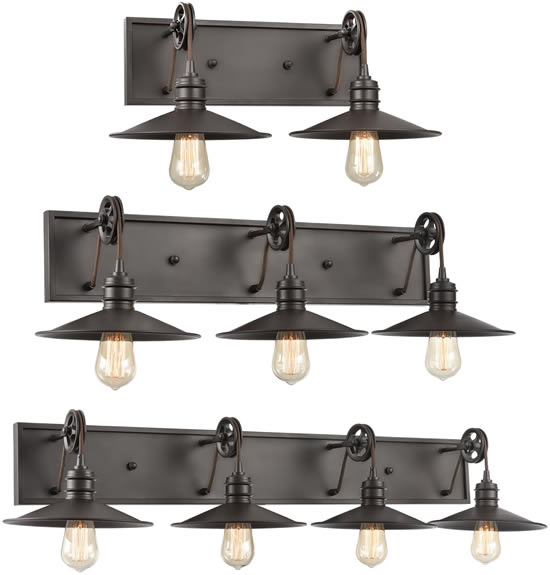 The Spindle Wheel Collection of Pulley Pendants, Bath and Wall Sconces is available in Oil Rubbed Bronze or Satin Nickel, which coordinates beautifully with galvanized metal finishes. Perfect for a farmhouse interior or give an instant Urban Industrial look. The collection includes pulley adjustable island or pool table pendants with two or four lights.