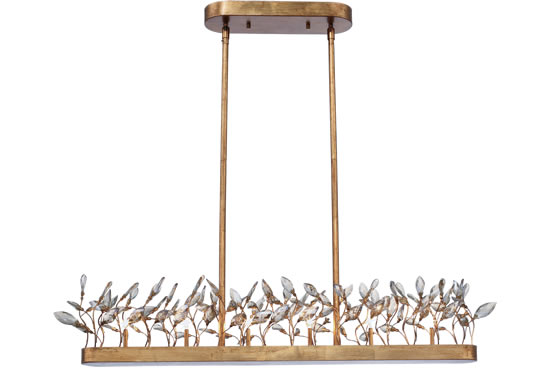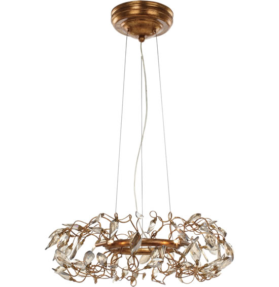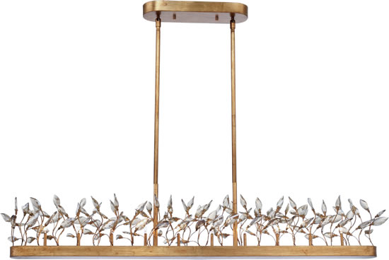 The Crystal Garden Collection by Maxim is finished in rich Gold Leaf. Hand formed wire stems finished in a support delicate petals of cognac crystal that create a beautiful garden of light. Petite G4 xenon lamps add brilliance and life to the sculpture. The collection includes ring and linear chandeliers. The coordinating wall sconce is rated for damp locations, so it is suitable as bath lighting.