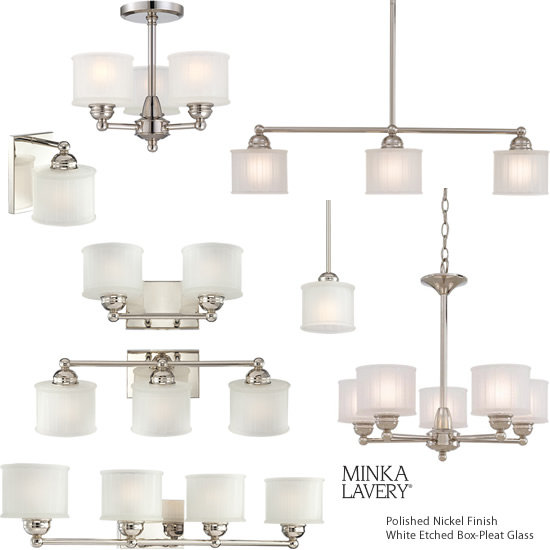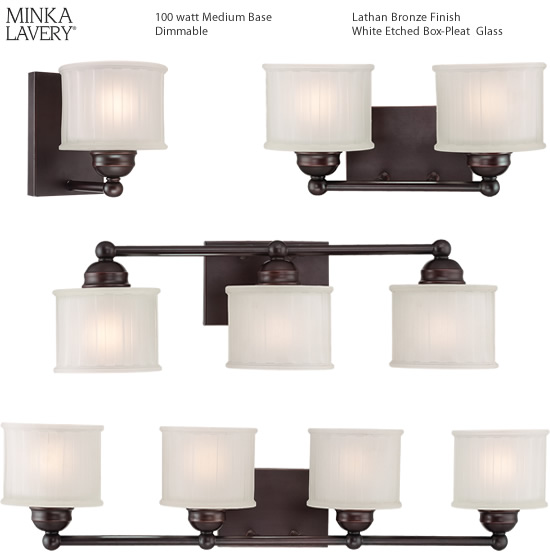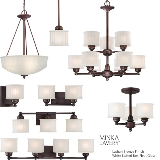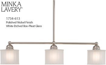 Minka-Lavery 1730 Series Lighting is practical and flexible enough to work with so many styles, from Farmhouse, to Modern to Traditional. White Etched Box-Pleat glass diffuses a Medium base rated up to 100 watts. Choose Lathan Bronze or Polished Nickel finish.