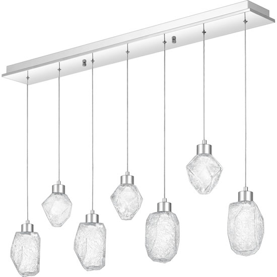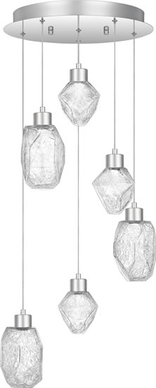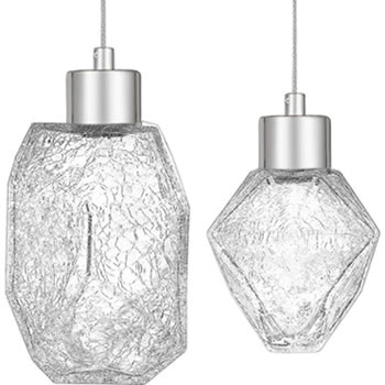 Drawing inspiration from geology, Hailstone pendant clusters are a real natural beauty. An assortment of multi-faceted shades in crackled glass add an organic flair, while a classic polished chrome finish and adjustable cables offer versatility.