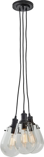 Black metal hardware and 3 clear glass pear-shaped shades with vintage-style bulbs cluster together to create a unique pendant. A long black fabric cord adds a stylish touch and can be adjusted to just the right height for any room.