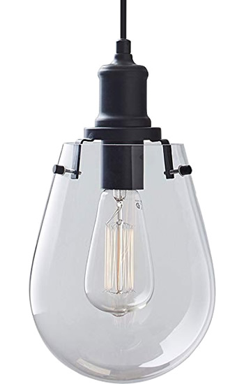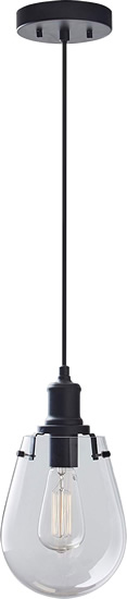 Black metal hardware, a pear-shaped clear glass shade and a vintage-style bulb come together to create this industrial-style pendant. A long black fabric cord adds a stylish touch and can be field adjusted to just the right height for any room.