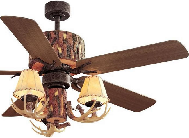 The Hampton Bay Lodge 52 in. Nutmeg Ceiling Fan is perfect for rustic settings as an accent in log cabins or mountain homes with its tree-trunk housing design and antler light kit. The fan blades offer flexible design options with reversible pine and nutmeg finishes. The tan canvas light shades house three 40 watt bulbs, includedfor ample lighting and the convenient remote control allows you to dim the lights or adjust the fan setting from a distance. The powerful motor delivers sufficient air movement for spaces up to 20 ft. x 20 ft.