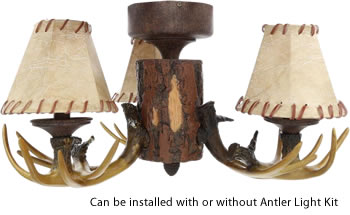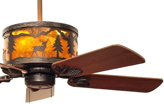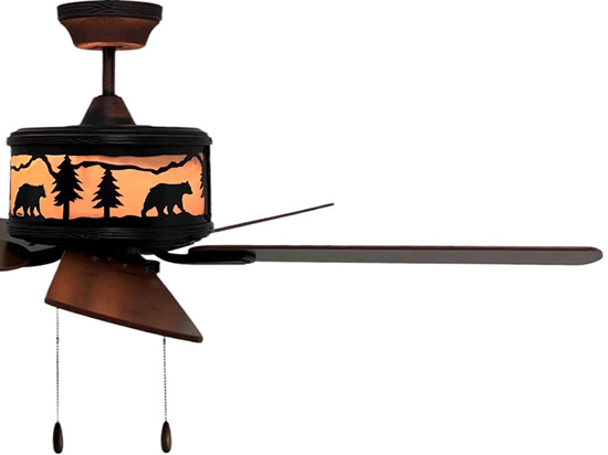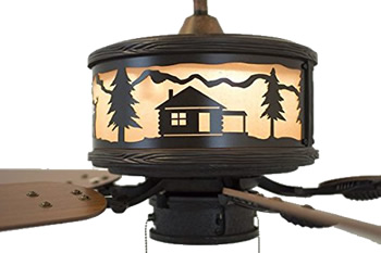 This beautiful rustic style ceiling fan features laser cut wilderness designs and back lighting to create a warm ambient accent. The fan includes laser cut panels Forest Animals design which include, moose, elk, deer and a bear. It uses 4-25 watt candelabra bulbs which can be controlled separately from an optional light kit.