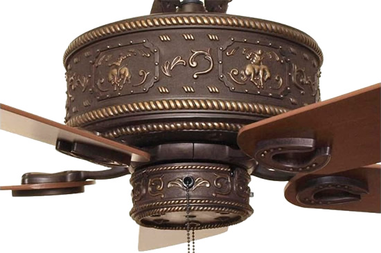 The Copper Canyon Sheridan Bronze Ceiling Fan features intricate rope design. Our Horse Design features an Amber Mica Liner surrounding the housing. Our reversible 52″ Antique Pine or Medium Oak Blades are attached with Horseshoe Medallions. This fan hangs down from your ceiling with a 4.5" Downrod.