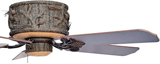 The popular Forest Breeze Fan is now available as a ceiling hugger model for rooms with limited ceiling clearance. Beautiful pine branch and pinecone details on a 52" fan that is only 9.5" high !