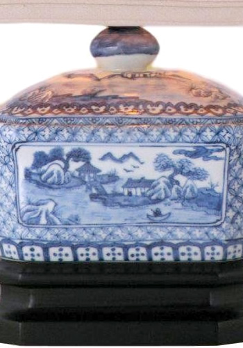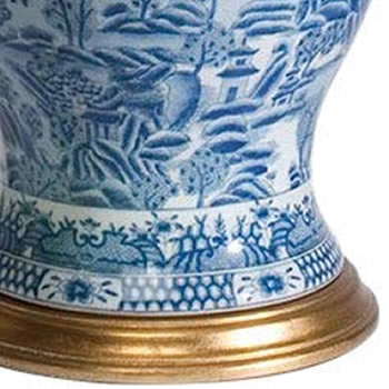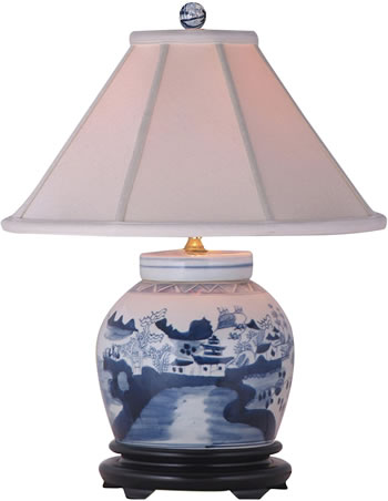 This Oriental blue and white ceramic table lamp has a large scale Asian landscape pattern. The smaller 19" high is ideal for a bedroom or anywhere you want to introduce the clean white look of traditional Asian transferware.