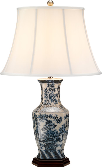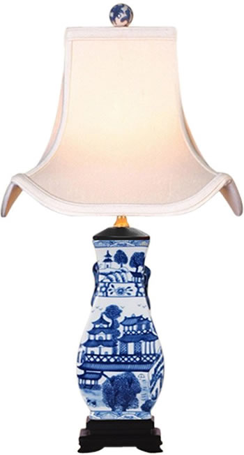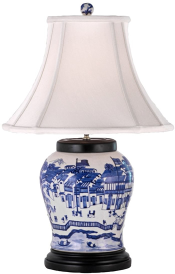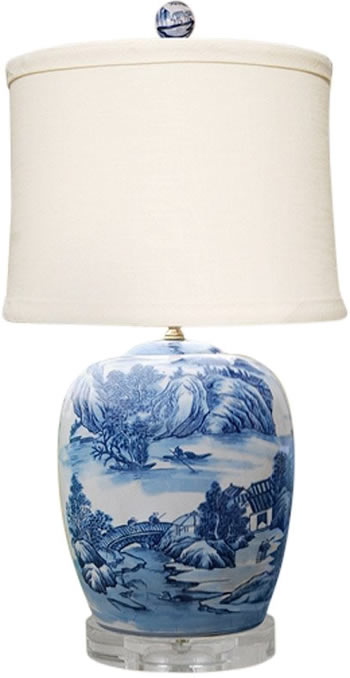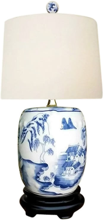 This Oriental blue and white ceramic table lamp has a landscape pattern reminiscent of blue willow china in a traditional toile pattern. The 27" high is ideal for your living room or anywhere you want to introduce the clean white look of traditional Asian transferware.