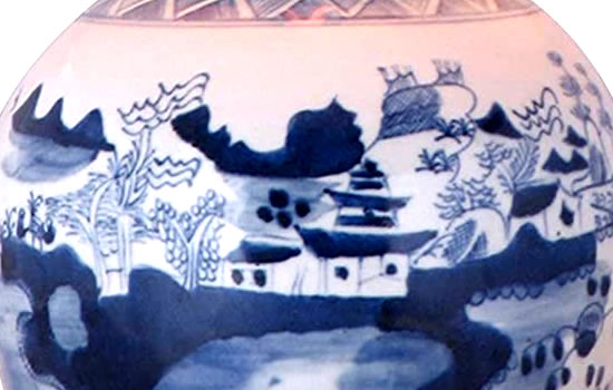 White Porcelain with Cobalt Blue Hand Painted Blue Willow Landscape