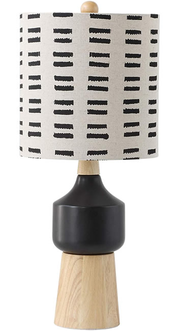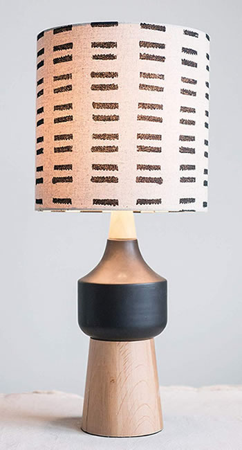 The brown and black colors on this lamp combine midcentury modern with natural finished wood. The base is a combination of ceramic and wood. The linen shade takes the colors of the base and repeats them with the solid back and black stripes.