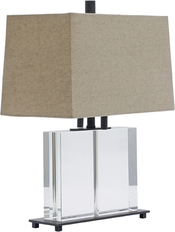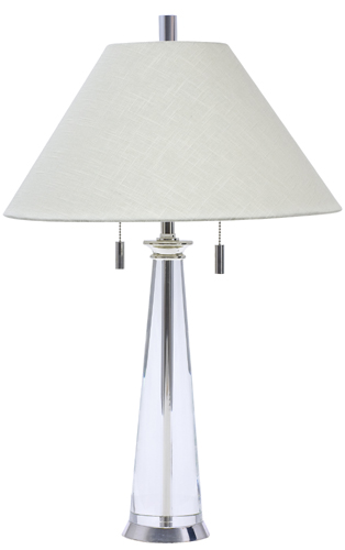 Solid crystal table lamp with double socket and twin pull switch. Linen hardback shade.