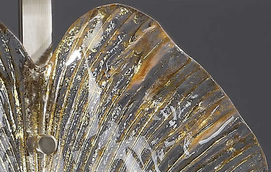 Decorative clear glass ginkgo leaf with gilded gold veining. This unique lamp sits on a brushed nickel plated stand. The rectangular hardback shade is in a white linen.