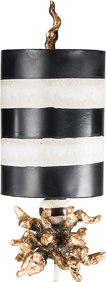Gold leaf star-shaped base with black and cream striped metal stem with gold leafed blossom. Complimentary striped shade and gold leafed finial.