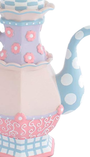 The adorable teapot or coffee server table lamp is a nice tall 19". The white shade is accessorized with a little ruffle at the top and bottom. Made of resin, so it's not fragile, then the very dimensional coffee server is hand painted in pretty light blue, lavender, two shades of pink and white.