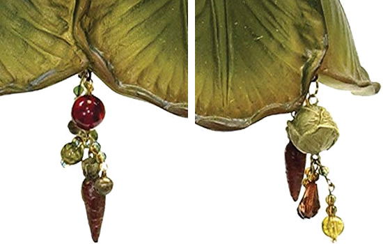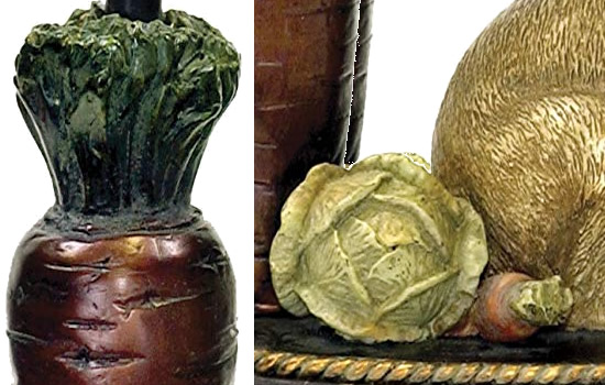 This adorable little lamp has a rabbit under a cabbage leaf surrounded by detailed vegetables. The cabbage leaf shade has a fringe of jewels shaped like miniature vegetables. Coordinating Bookends available.