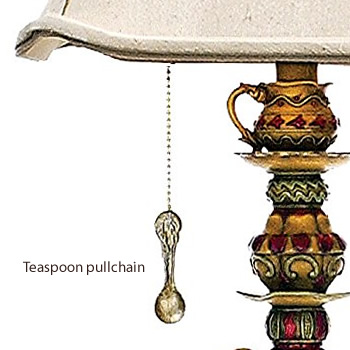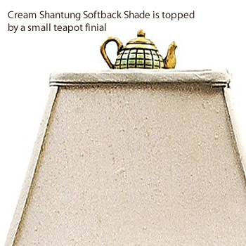 The whimsical Tea Party Candlestick Lamp has a balanced tea service supporting a bright table lamp. The pull chain switch has a teaspoon pull. The Cream Shantung Softback Shade is topped by a small teapot finial.