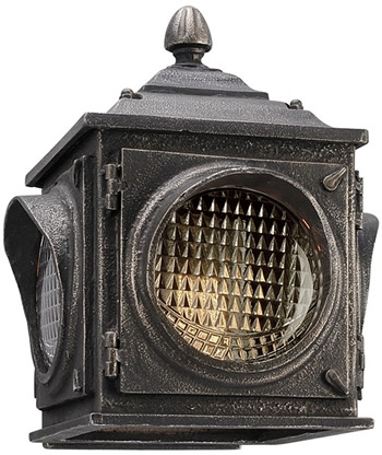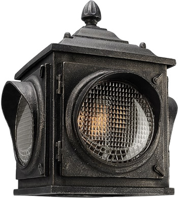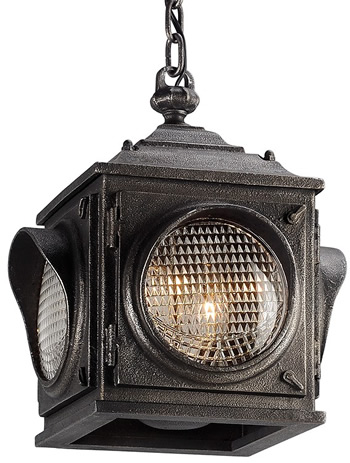 The Main Street Collection draws inspiration from early traffic lights and the lights to signal trains. Three sizes of wall lanterns, a hanging pendant and a post light are all finished in Aged Pewter. The heavy pressed glass diffuses light like the lens in a traffic signal.