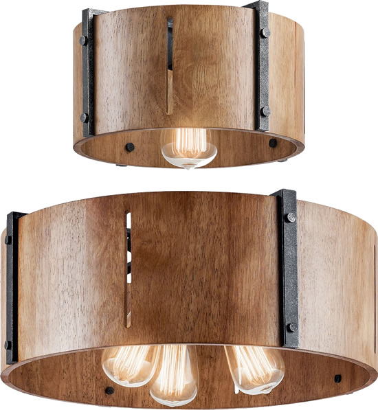 Inspired by the wood paneling that defined an era, Elbur Pendant and Semi Flush Ceiling Lights evoke mid-century design for decorating versatility. The weather-worn look of the black distressed iron gives it a vintage feel and the softly curved natural maple panels mirror lines found in 50s and 60s furniture.