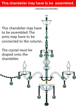This chandelier must be assembled. It ships carefully packed. The arms must be connected to the column. There are two wires per arm that clip into the sockets in the column. Then all of the crystal is draped onto the chandelier.