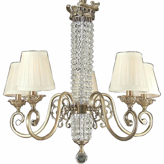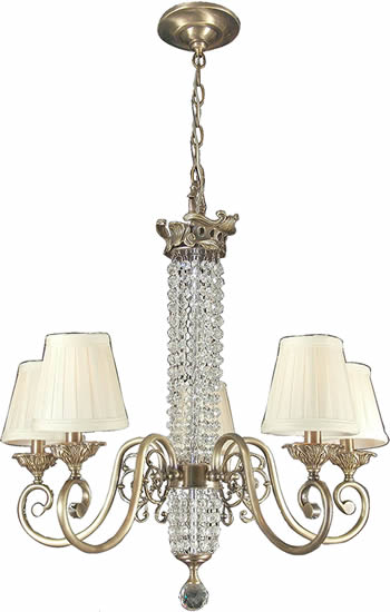 Kathy Ireland's Ramas de Luces collection offers dramatic detailing and styling with unmistakable glamour. This design features five uplights clustered around a center column decorated with lavish scroll-work and crystal droplets. The column contains a center downlight to help accent and brighten table surfaces. Amber bell glass offers a warm glow.