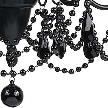 The Mischief Black Crystal Chandelier has a black metal frame with intricate scroll work and black glass beads suspended from silver chains.