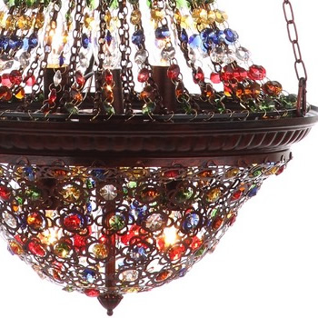 Inspired by Venetian art glass and Moroccan artwork, this dark bronze 15.25-inch diameter pendant lamp with colorful beads elevates any corner. Designers love to use it in pairs alongside the living room sofa, or alongside the bed to create an artistic, stylish focal point.