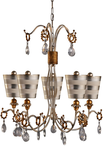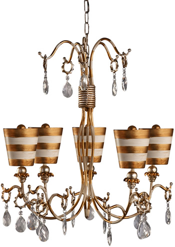 "Tivoli" Gold 5-Arm Chandelier showcases hand finished metal striped shades and fixture arms detailed with contrasting finished stars and coil wrap.