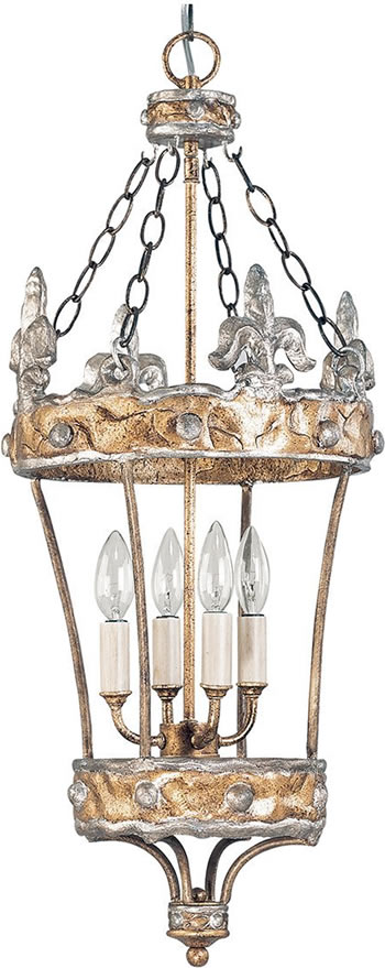 The Flambeau Crown Hoop Chandelier has a quirky Medieval look, with heraldic fleur de lis emblems and a hoop frame. Sculptured elements add character and style to this Benjamin Burts designed 4-arm chandelier lantern.