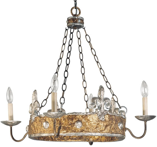 The Flambeau Crown Hoop Chandelier has a quirky Medieval look, with heraldic fleur de lis emblems and a hoop frame. Sculptured elements add character and style to this Benjamin Burts designed 4-arm chandelier.
