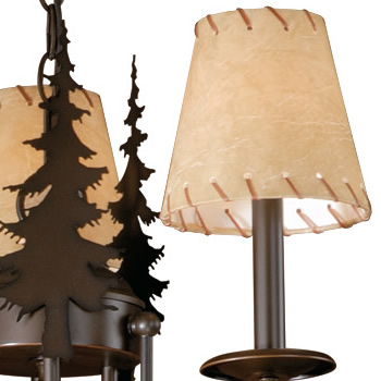 The Teton Hex Chandelier Small - Mtn Horse has six side panels featuring nature scenes alternating around the bowl (e.g., horse scene, tree only scene, horse scene, etc.) and a hexagon bottom which has a downlight. Both the sides and bottom have mica shade material with a choice of color between Almond or Amber. Fixture comes with a matching hexagon shaped ceiling canopy, 3 feet of chain (for between the ceiling and the fixture) and 10 extra feet of wire. Open top. Hardwire is standard. This rustic chandelier is ideal for anyone looking for a hanging light to bring rustic lighting to their log home, cabin or northwood lodge-themed room.