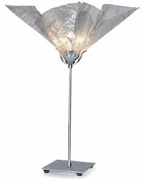 The Ariel beams light through layers of folded mesh. The standing lamps have a silver or rust base. The Table Lamp has a Hi/Lo dimmer switch and the Floor lamp features a full range dimmer. The Ariel is a double-layered shade with softer edges and a more open bottom than its cousin the Star.