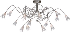 A handmade range of hanging, ceiling, table and floor lamps. Frame of stainless steel with 6 mm tube. The tubes can be twisted and stretched in every direction. Rod length are changeable. The Flag glasses are fixed through a G4 click system. The lighting fixtures are executed in halogen 12V G4 with built-in electronic transformer. Table and floor lamp with electronic dimmer.