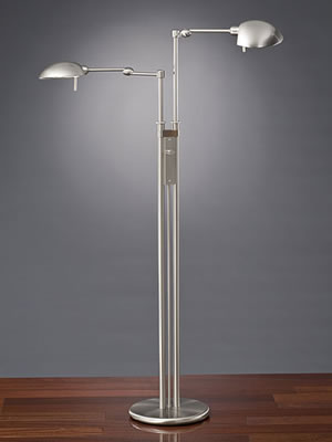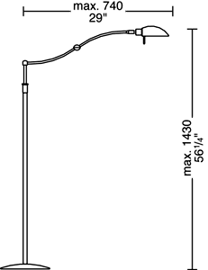 The twin-light Floor lamp, 2505/2, is the perfect solution for two light sources in one lamp. Both arms are independently Adjustable and dimmable. Vertical adjustment of each arm from 40" to 57" with a maximum Extension of 20". Two turn-knob dimmers in easy reach adjust 100 Watt halogen bulbs by Osram in each arm.