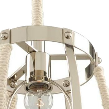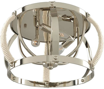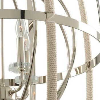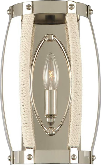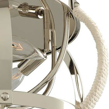 The Bradbury Collection from Kalco has pendants in three sizes with a coordinating wall sconce and ceiling light. The polished nickel finish with natural rope adds nautical touches for your coastal home. The two larger pendants have clear optic crystal bobeches finishing each polished nickel candle sleeve. The largest lantern style pendant cages an orb chandelier. The wall sconce is ADA compliant with only a 4-inch Extension.