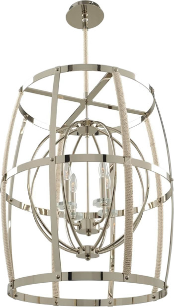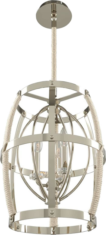 The Bradbury Collection from Kalco has pendants in three sizes with a coordinating wall sconce and ceiling light. The polished nickel finish with natural rope adds nautical touches for your coastal home. The two larger pendants have clear optic crystal bobeches finishing each polished nickel candle sleeve. The largest lantern style pendant cages an orb chandelier. The others have modified orbs. The wall sconce is ADA compliant with only a 4-inch Extension .