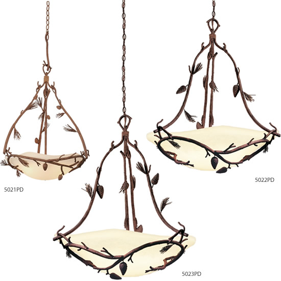 Nature comes to light with the rustic Kalco Ponderosa Collection, featuring pinecones, pine needles and branches of simulated bark.